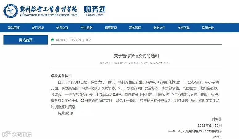 周口师范学院、郑州轻工业大学、郑州航空工业管理学院等高校也都发布了类似的公告,原因都是微信支付针对校园行业开始收取服务费用。