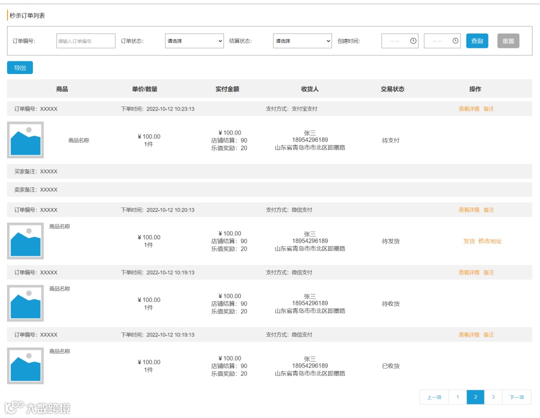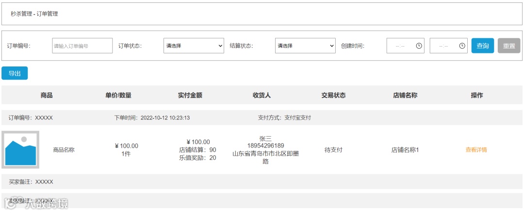 订单编号支持精准查询,订单状态包含:待支付、待发货、待收货、已收货、已完成、已关闭;结算状态包含:未结算、结算中和已结算;创建时间精确到秒;