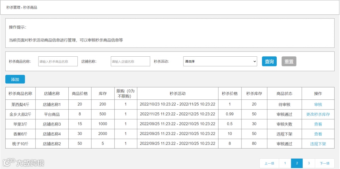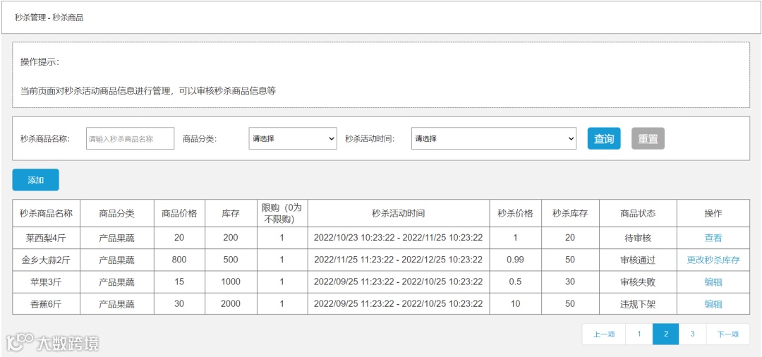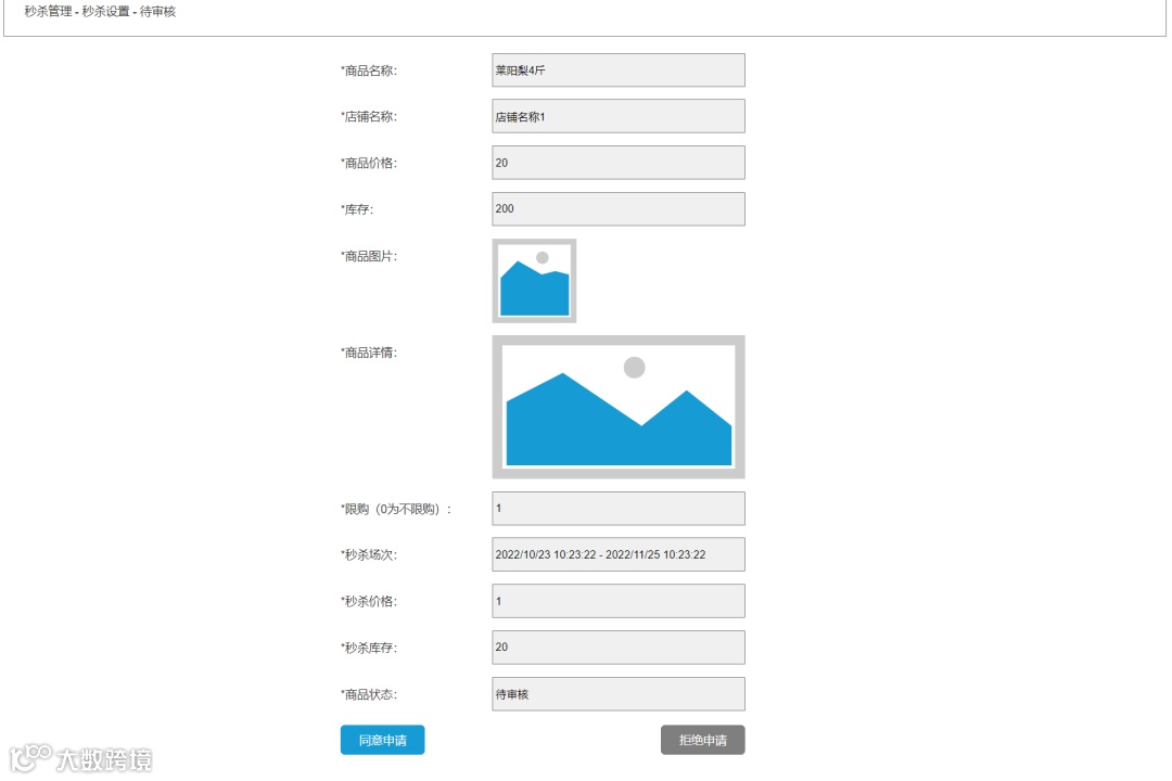 商户添加秒杀商品完成,秒杀状态待审核,可查看操作;
