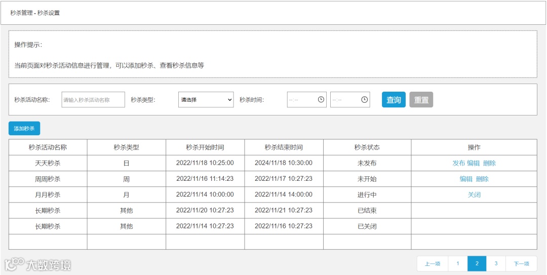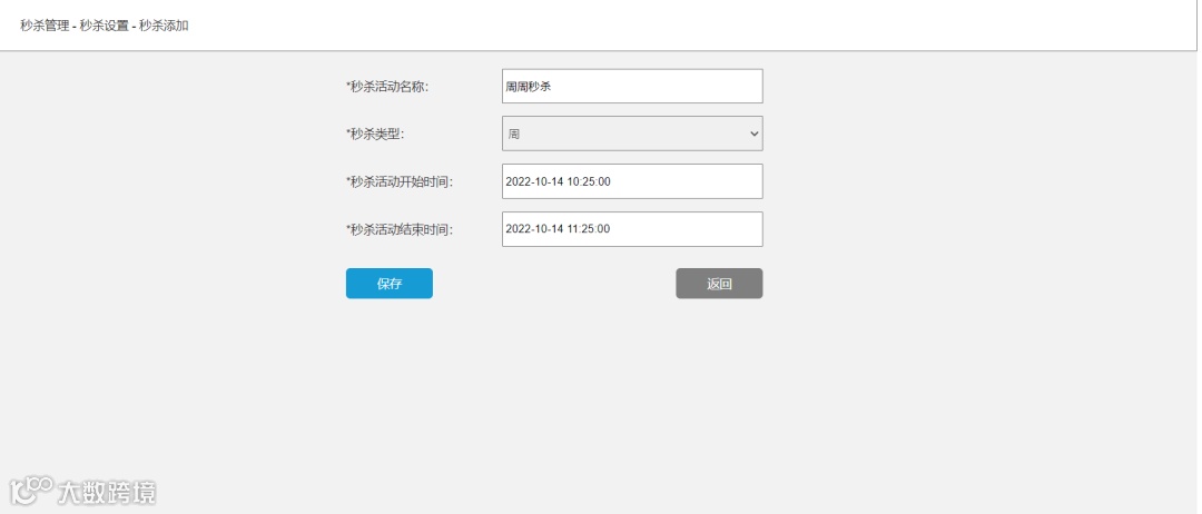 例如秒杀批次开始时间:2022年11月1日 0点0分0秒,秒杀开始时间为9:00,秒杀结束时间为10:00,秒杀类型为日,秒杀批次结束时间为2022年11月3日0点0分0秒,点击保存按钮,会生成2022/11/1 9:00:00 – 2022/11/1 10:00:00和2022/11/2 9:00:00 – 2022/11/2 10:00:00,两个秒杀活动信息;