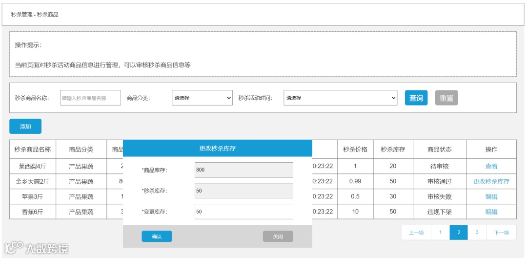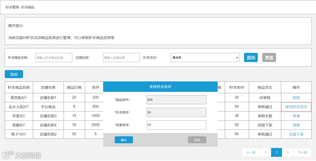 审核通过,可更改秒杀库存操作,点击弹窗显示更改秒杀库存页面,可修改秒杀库存信息;