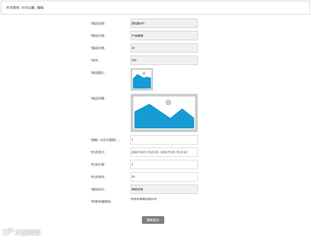 秒杀状态待审核,可审核操作,点击审核按钮,跳转到审核页面,审核失败,商品状态:审核失败;根据商户联系方式发送短信通知,通知内容 “XX商品的秒杀审核失败,请及时修改”