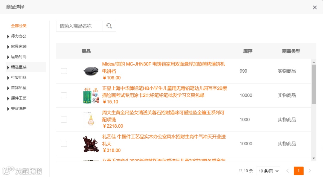 点击商品名称弹窗显示选择商品页面,可根据商品分类或者商品名称查询商品信息;根据商品名称显示商品分类、商品价格、商品库存、商品图片和商品详情;