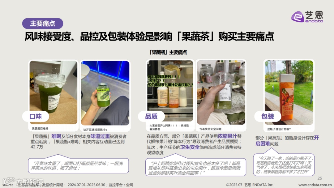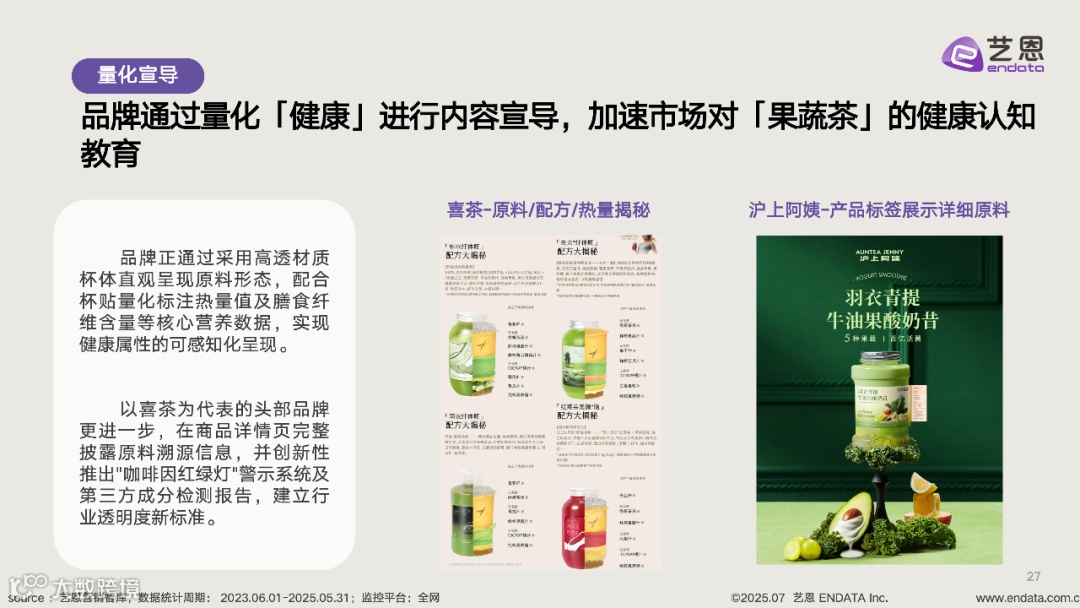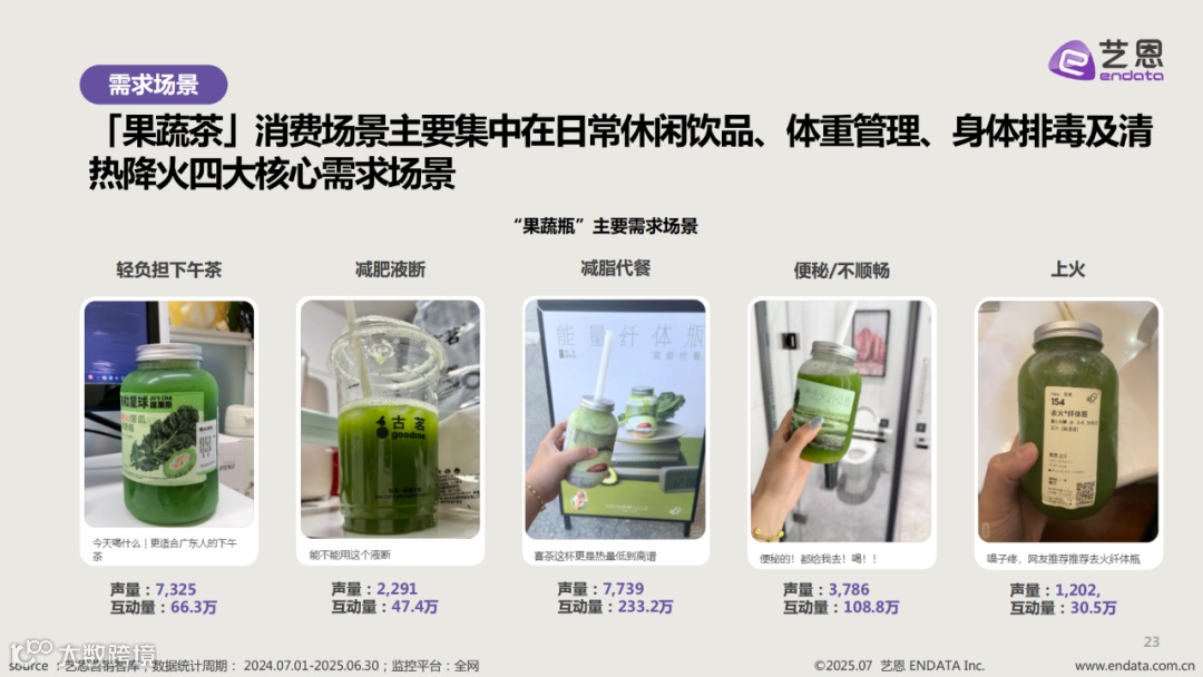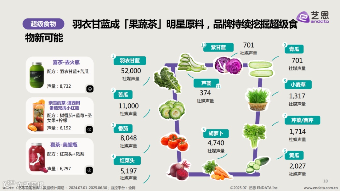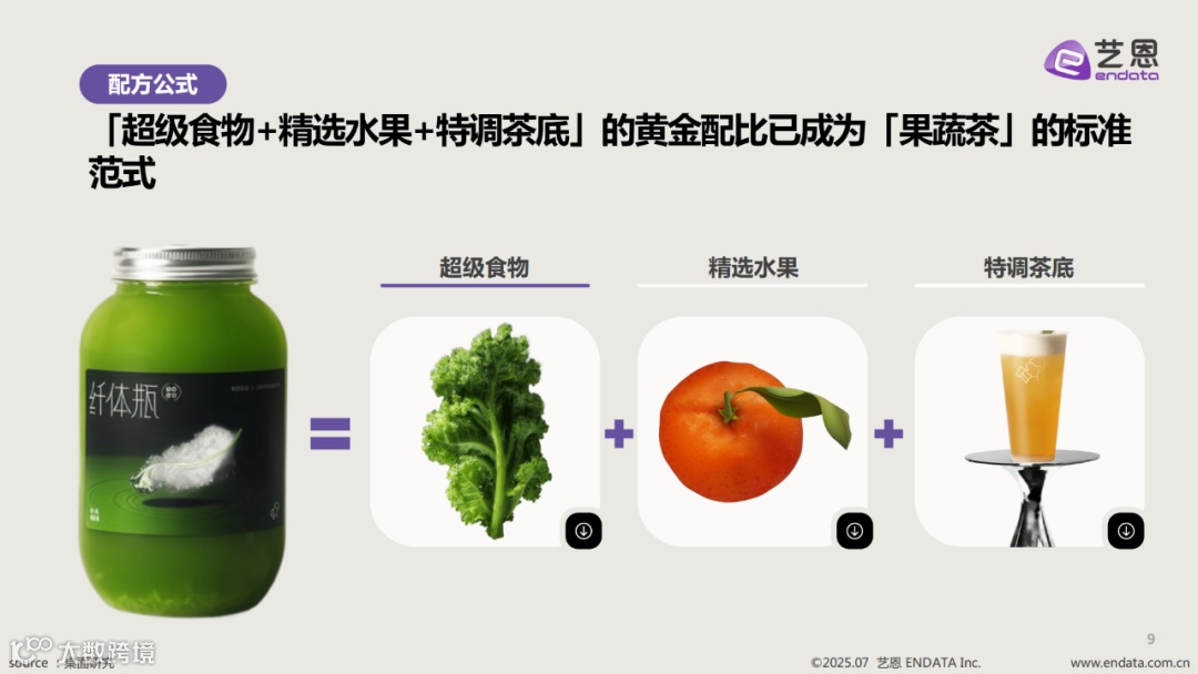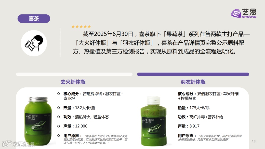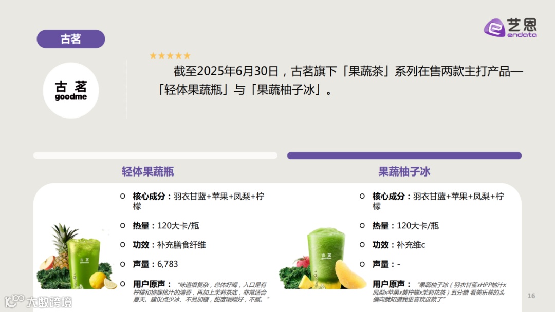 在健康消费趋势推动下,果蔬茶饮迅速崛起为新茶饮行业热点。2024年,喜茶推出「羽衣纤体瓶」引领风潮,古茗、沪上阿姨等品牌相继布局,推出「轻体果蔬瓶」「芭乐树番茄发光瓶」等产品,凭借健康属性与独特口感赢得市场青睐,销量持续攀升。
