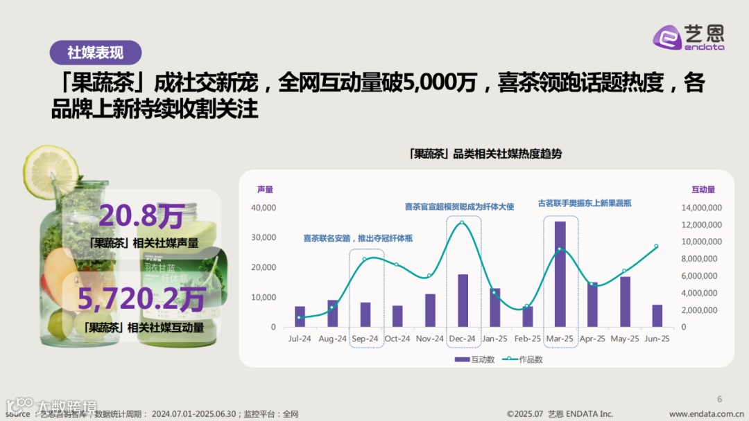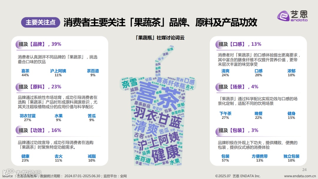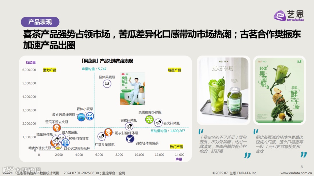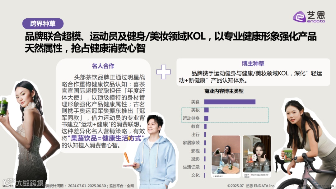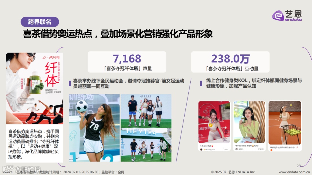 数据显示,94%的消费者将健康列为优先考量,Z世代尤其注重控糖减脂。果蔬茶饮以低糖、低卡、高纤维特性精准契合需求,成为健康饮品新选择。品牌通过明星代言、联名合作等方式强化健康形象,如喜茶携手超模贺聪并联名安踏推出「夺冠纤体瓶」,古茗联合奥运冠军樊振东打造「冠军同款」,进一步提升产品认知与影响力。