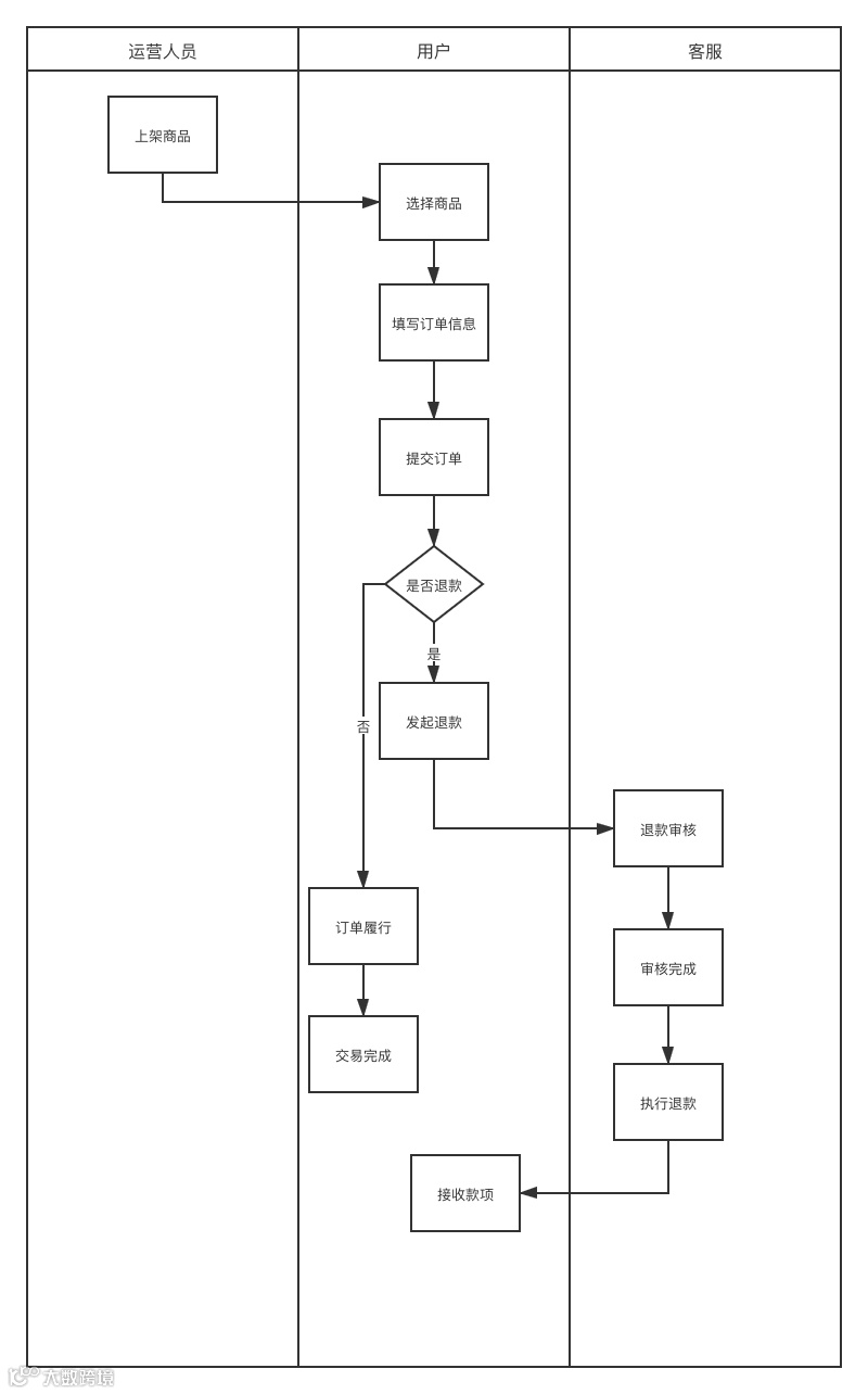 围绕这两点,基于我们已经收集到的业务信息,我们可以梳理下一个阶段的业务流程,以此判断哪些角色哪些行为未来是需要被搞到线上去,或者搞成自动化的。为了让思考更聚焦,我们可以尝试用一张作业流程图来引导我们思考。作业流程图需要反映出角色、作业环节、以及环节之间的流转关系。