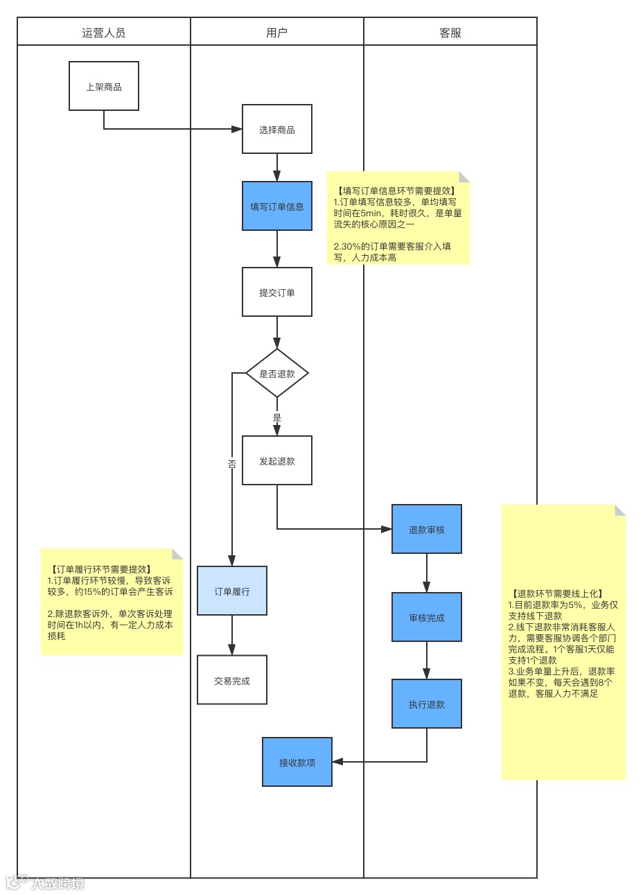 从图中可以看出,规模化增长可能导致原有的客服成本增长,我们需要对订单创建和退款环节进行系统支持,控制这部分成本。虽然订单履行阶段也占用客服人力,但成本相对可控,根据优先级,我们本期可以不对其进行改造。