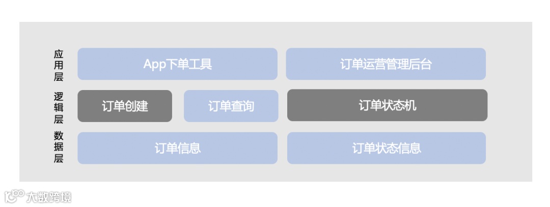 下图是一个订单系统框架的简单示意。从图上我们可以看出,该订单系统处在早期阶段,仅有7个模块,其中订单创建和订单状态机是两个临时搭建的模块,有可能下一次需求到来,我们就要进行改造。
