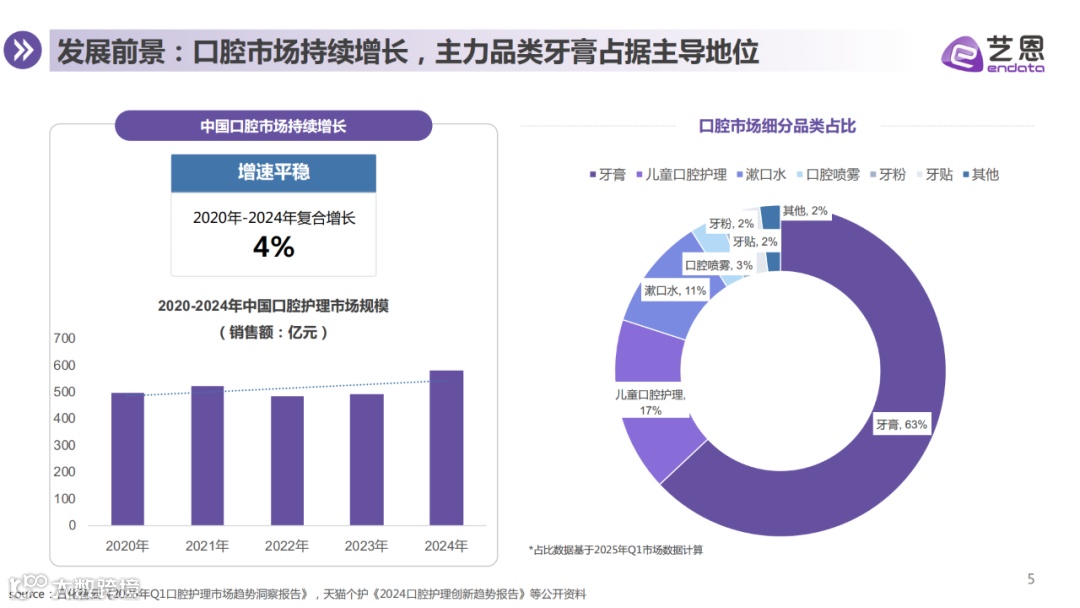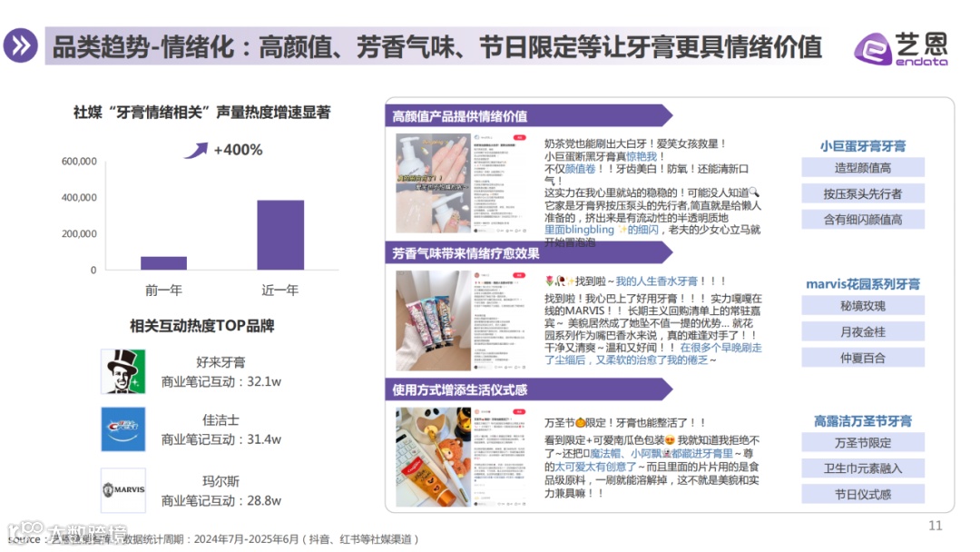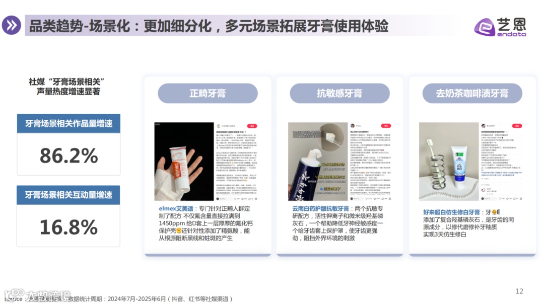 随着口腔健康意识增强,牙膏市场持续增长,品类升级趋势显著。消费者需求呈现多元化、精细化特征,清洁与美白仍是核心功效诉求,抗敏、修复牙釉质等功能性需求潜力凸显。产品发展趋向专业化、情绪化与场景化,成分竞争加剧,护理更精细;高颜值设计、芳香气味及节日限定款提升情绪价值;使用场景不断细分,体验持续拓展。