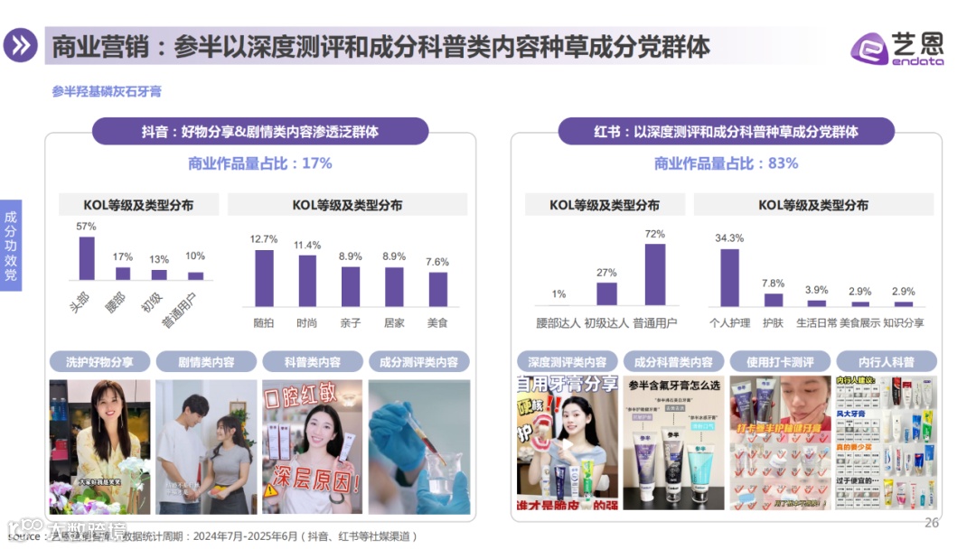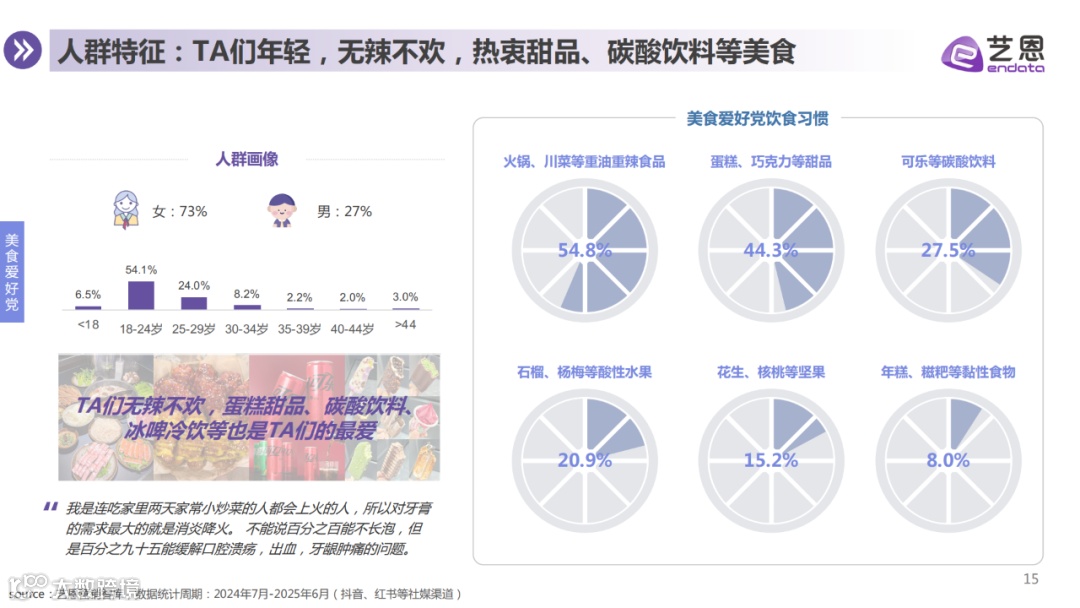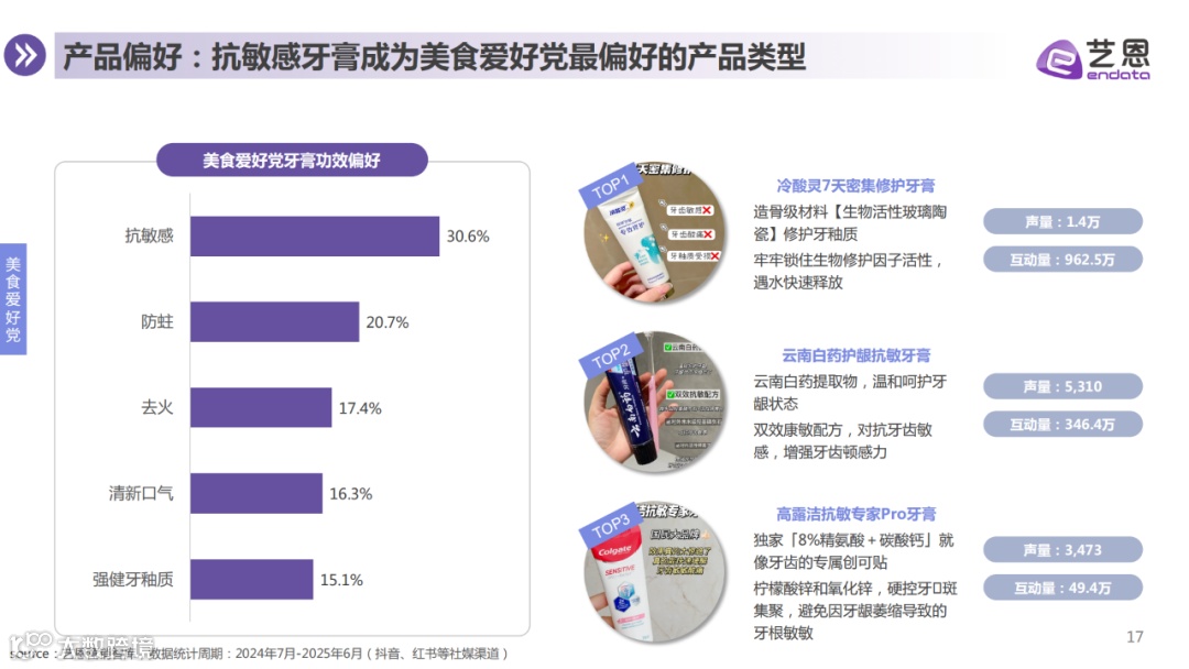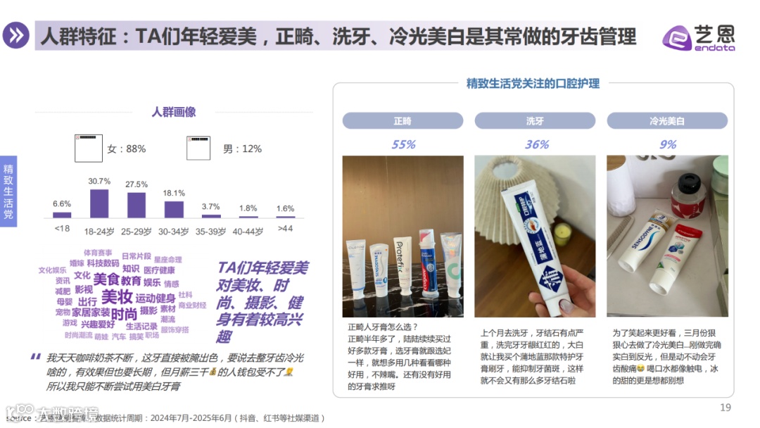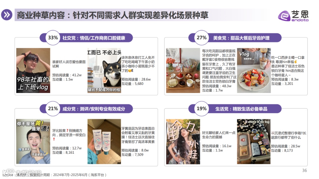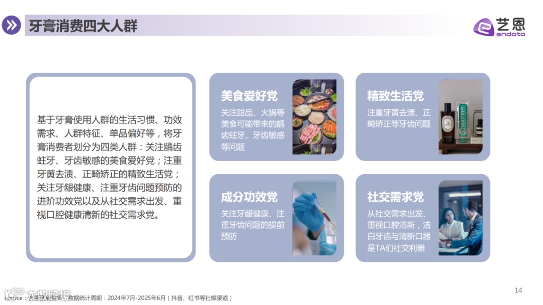 消费者购买行为趋于理性。基于生活习惯、功效需求、人群特征及单品偏好,牙膏用户可划分为美食爱好党、精致生活党、成分功效党、社交需求党四大群体,各类人群在痛点、产品偏好等方面存在明显差异,品牌亦据此开展差异化内容种草与营销布局。
