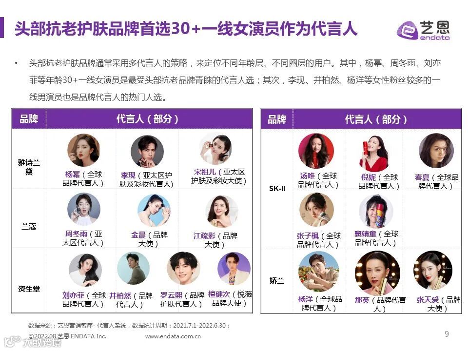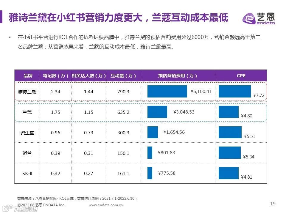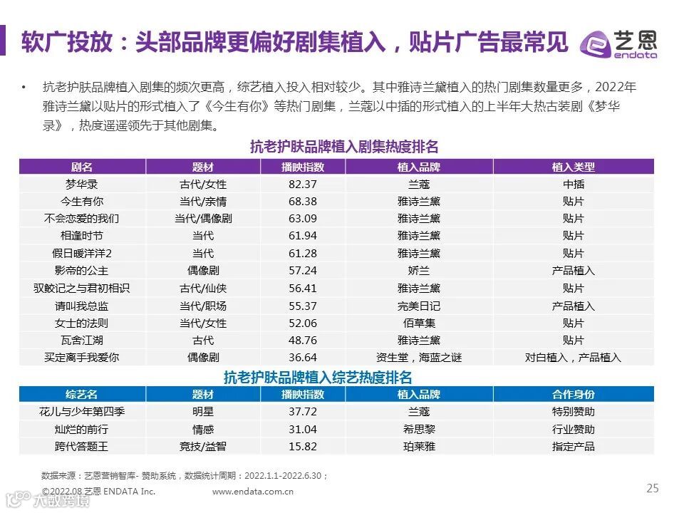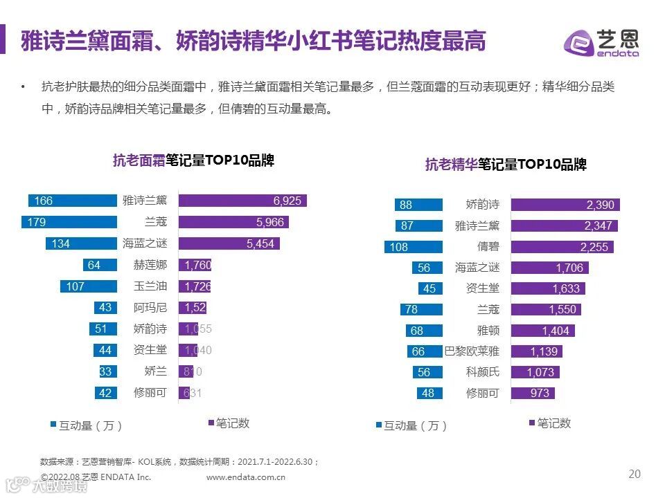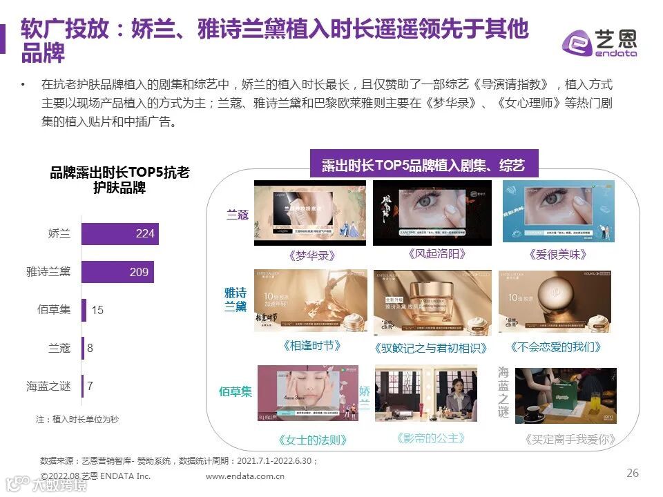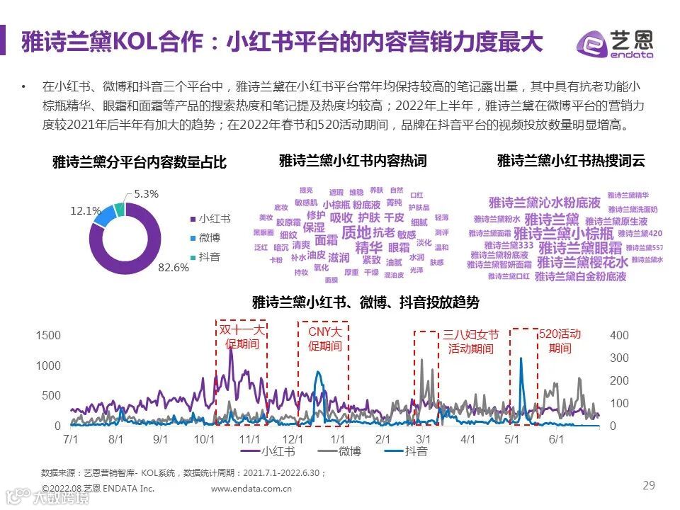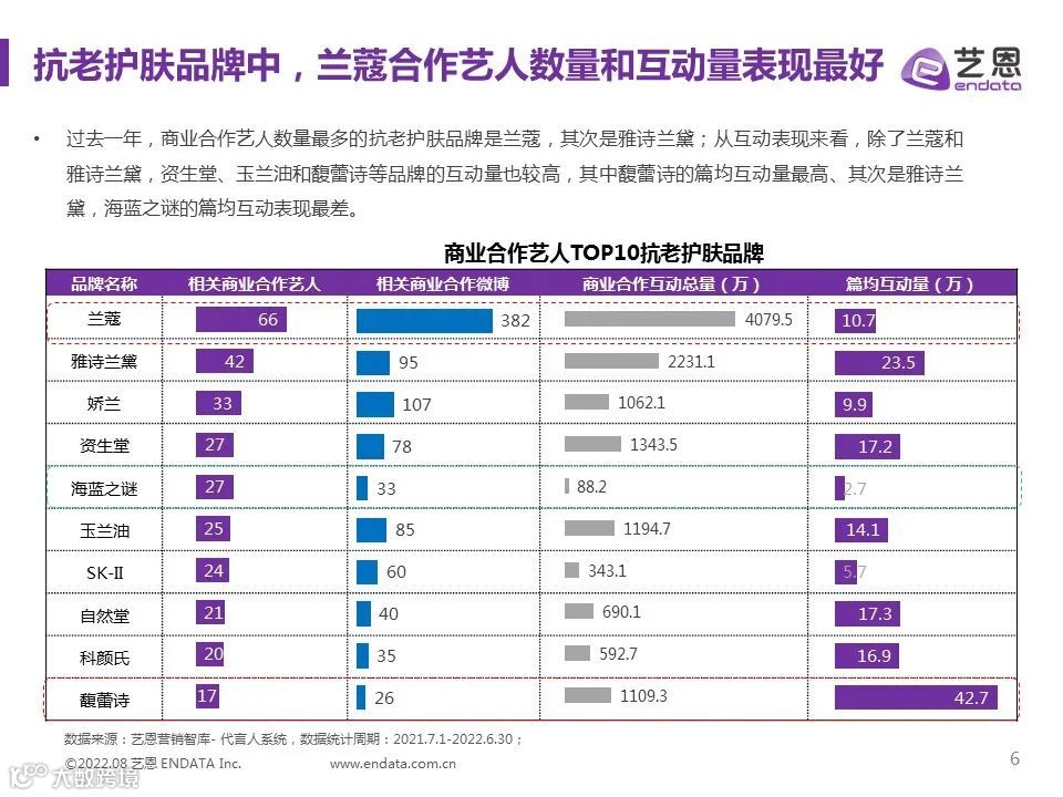 艺恩数据雅诗兰黛、海蓝之谜、兰蔻等高端品牌占据抗老护肤市场主要份额。这些品牌通过小红书、抖音、微博等社交平台开展明星与KOL内容营销,同时布局剧集和综艺软性广告投放,以提升曝光度、知名度及用户规模。