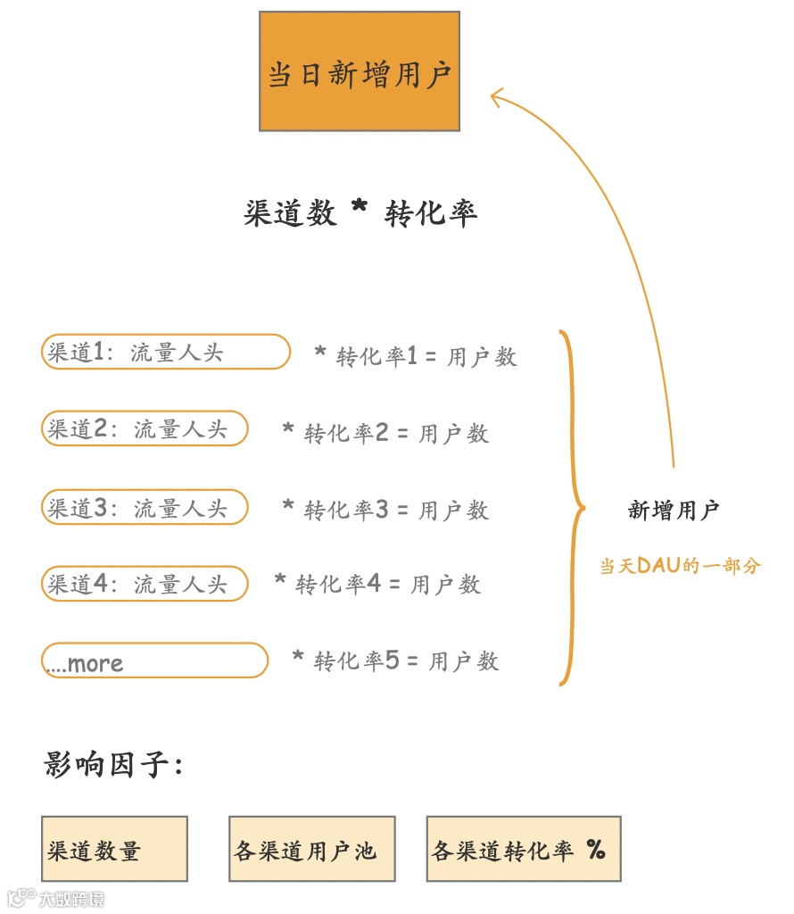 未注册过、未登录过、未使用APP的用户,如果因为渠道导流、口碑推荐等,自行下载并登录使用APP,在统计日内,贡献DAU,即新增用户。