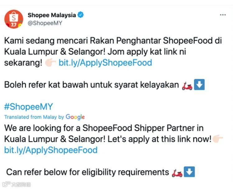 此外,在今年早些时候Shopee曾在其官方社交媒体账号上宣布,其外卖服务ShopeeFood已开始在吉隆坡和雪兰莪州招聘外卖快递员。这可能预示着ShopeeFood的外卖服务将在马来西亚推出,使该国继印尼之后成为Shopee推出外卖业务的下一站。此前, ShopeeFood于2020年底在印尼启动。