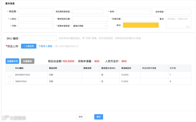 代销入仓/经销商家,由采购部门向商家下采购申请单。 -