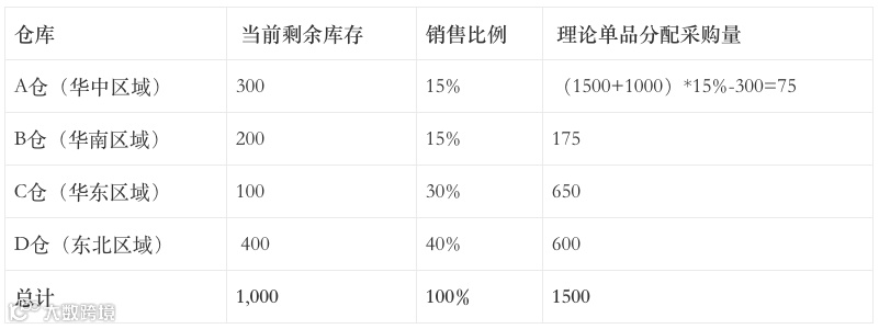 该仓单品分配采购量=(总采购量+单品在所有大区仓剩余库存)*大区占比-该仓所在区域的单品的剩余库存