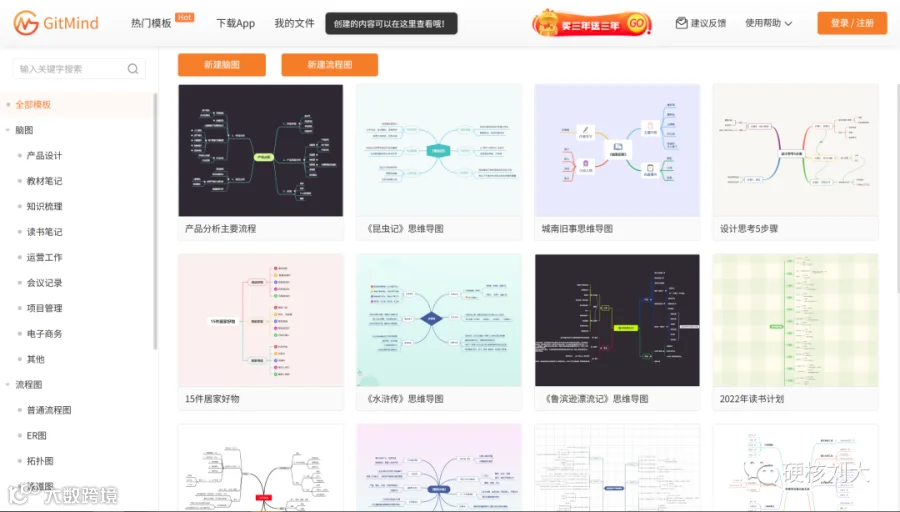 软件内置海量模板,全部可以免费编辑使用,一共分为脑图和流程图两大类,每一类又分为多个小类,比如流程图则细分为活动图、类图、拓扑图、数据流图、ER图等等二十多个小类。每一个小类里面又包含海量的模板,适合各种办公学习场景的思维导图。