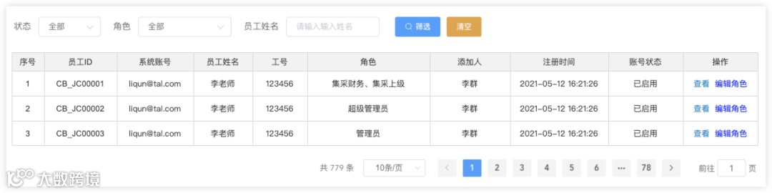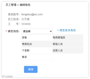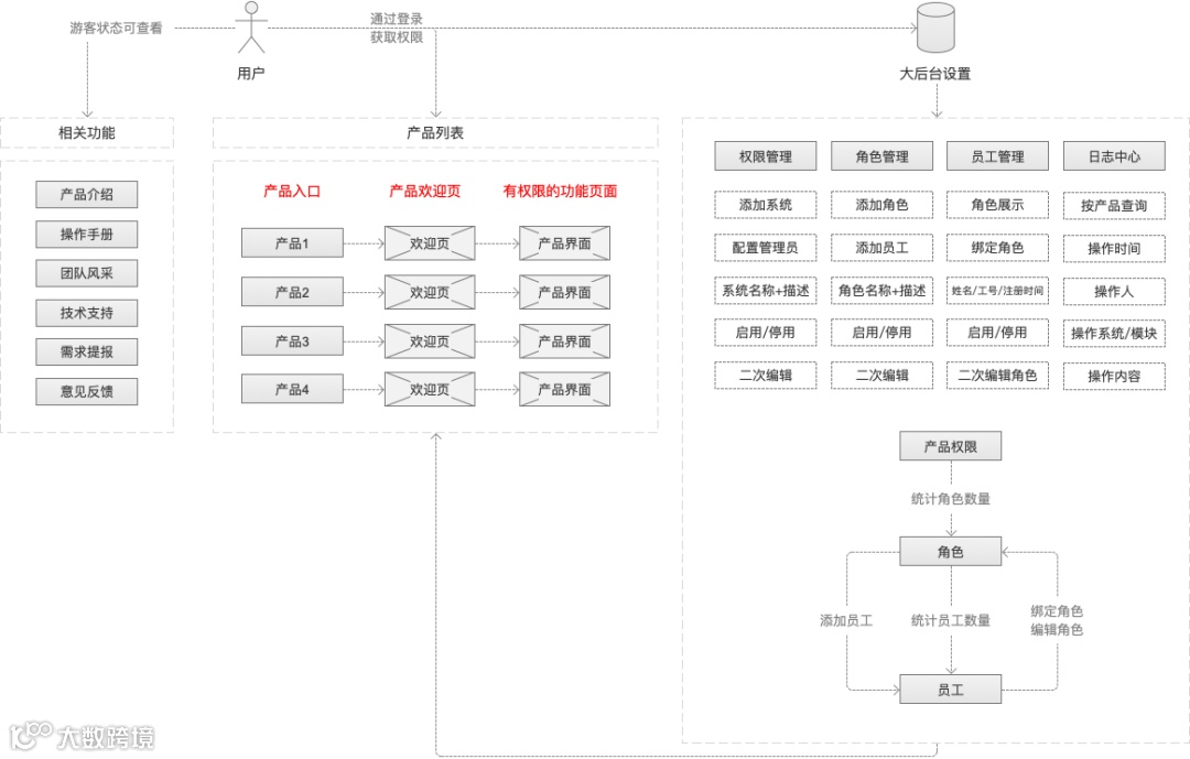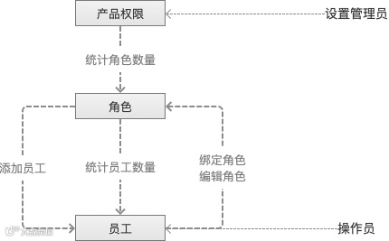 每个员工账号都通过内部通讯工具实名认证登录,归属于某个(或多个)角色,具有操作某个(或多个)产品相关功能模块的权限。