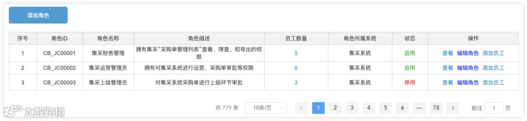 可灵活地为多个产品配置不同导航和操作权限,一个角色可设置多个员工账号。