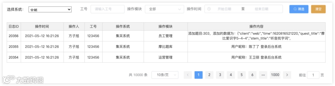 统一记录所有产品、所有角色、所有员工的所有关键操作记录。