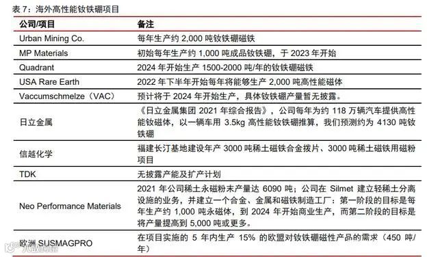 美国目前仅Urban Mining Co.具备烧结钕铁硼生产能力,年产能约2000吨。MP Materials与VAC计划进入磁材制造领域,Rare Earth和Quadrant分别计划2022年下半年和2024年投产2000吨和1500吨高性能钕铁硼项目。