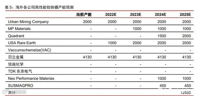 国内高性能钕铁硼产能扩张迅速。根据上市公司公告统计,2021年中国高性能钕铁硼毛坯产能约10万吨,预计到2025年将达25万吨,2021–2025年CAGR约为25.6%。