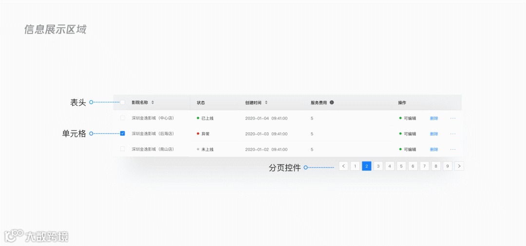 表头、信息展示单元格、分页控件。