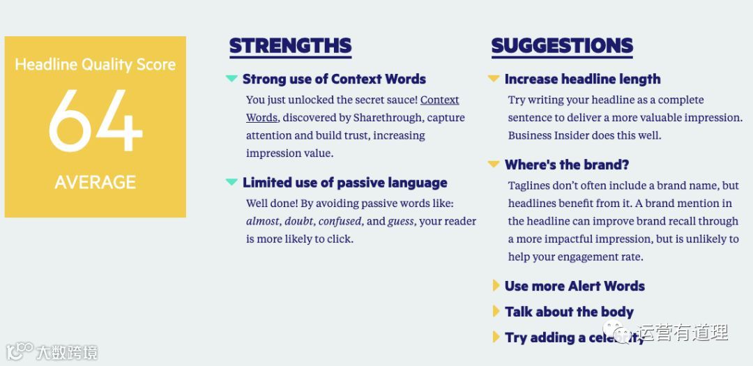 我们尝试输入标题:7 Free Headline Analyzer Tools,该工具会对标题进行打分,并且给出具体的建议: