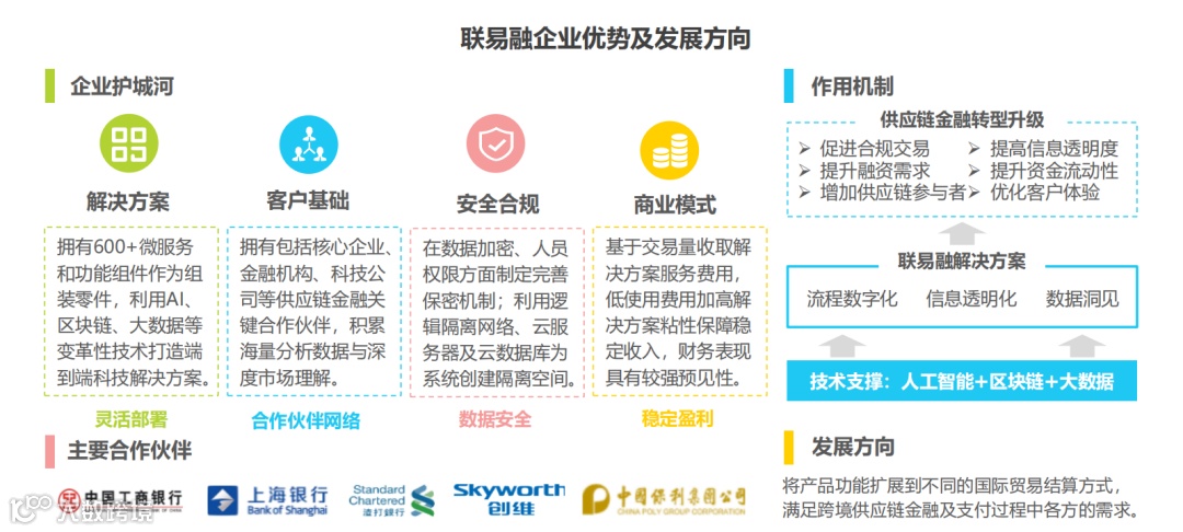 联易融通过其专业的解决方案和灵活的部署形式积累了大量客户,帮助客户实现供应链金融转型升级,并通过对数据进行脱敏处理和加密传输保障客户数据安全。全方位的解决方案、扎实的客户基础、严格的数据安全和合规保障以及可持续的商业模式,共同构成联易融的护城河,支撑其业务稳步扩张。未来联易融将持续推进技术创新,拓展并强化供应链金融生态系统,让产品功能覆盖不同的国际贸易结算方式,以满足支付过程中各方的需求。