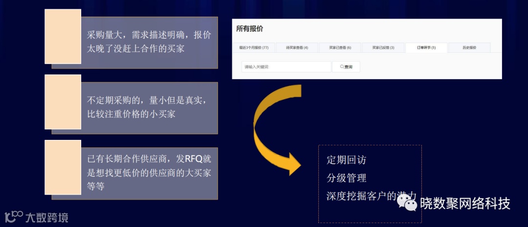 - 通过登录天数、报价查看次数、近90天采购行为评估买家活跃度与真实需求。