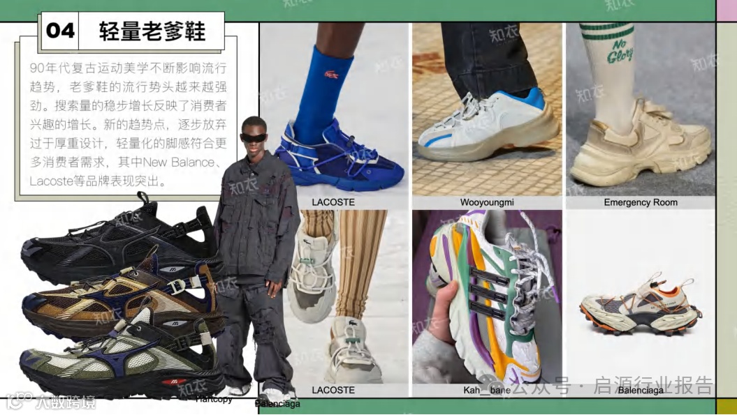 易穿脱设计广泛应用尼龙搭扣、拉链及弹性闭合系统,结合隐藏饰边与可拆卸部件,满足多场景使用需求。老爹鞋在90年代复古美学驱动下回暖,趋向轻量化脚感,New Balance、Lacoste等品牌表现亮眼。