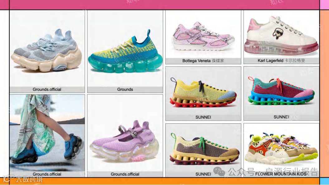 果冻运动鞋以明亮色彩、童趣造型和蓬松质感脱颖而出,核心在于采用橡胶、乳胶等胶状材料打造弹性鞋底,营造“软弹”体验,主推果冻薄荷、水果糖色等闪烁粉调与高饱和亮色。