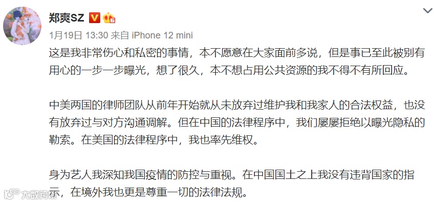 1月18号,郑爽前男友张恒一改往日沉默,突然在微博发文澄清了一些一直围绕在他身上的“不实传言”。