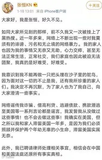 大致意思是说,网上流传关于他的诈骗、借高利贷、逃避债款、携款潜逃美国是谣言。他和家人之所以滞留美国是因为要照顾两个年幼的孩子,此外已经聘请律师在法庭上还原真相。并晒出了自己抱着两个孩子 的照片。