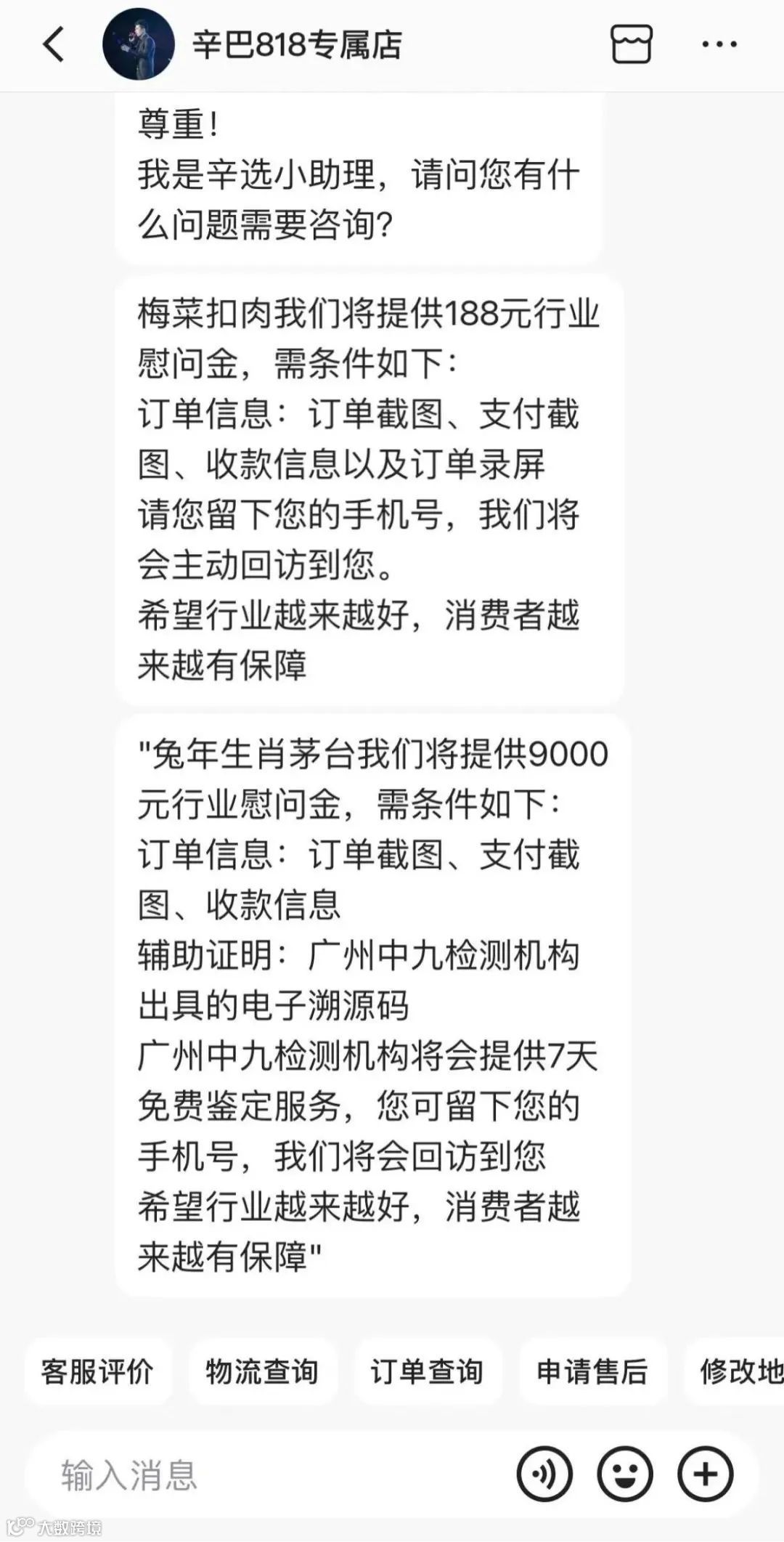 截图显示,当消费者发送“梅菜扣肉”“茅台”等关键词后,辛选客服会回应表示,将提供“行业慰问金”作为补偿。