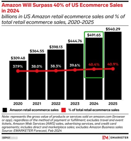作为Temu起家的地方,美国市场同样是亚马逊的主战场。去年,亚马逊在美国的市场份额为39.6%,据权威市场研究机构eMarketer发布的最新预测数据显示,2024年亚马逊将占据美国零售电商销售额的40.4%。