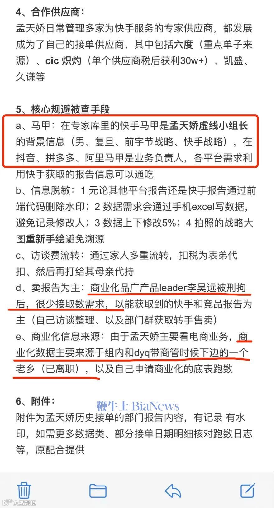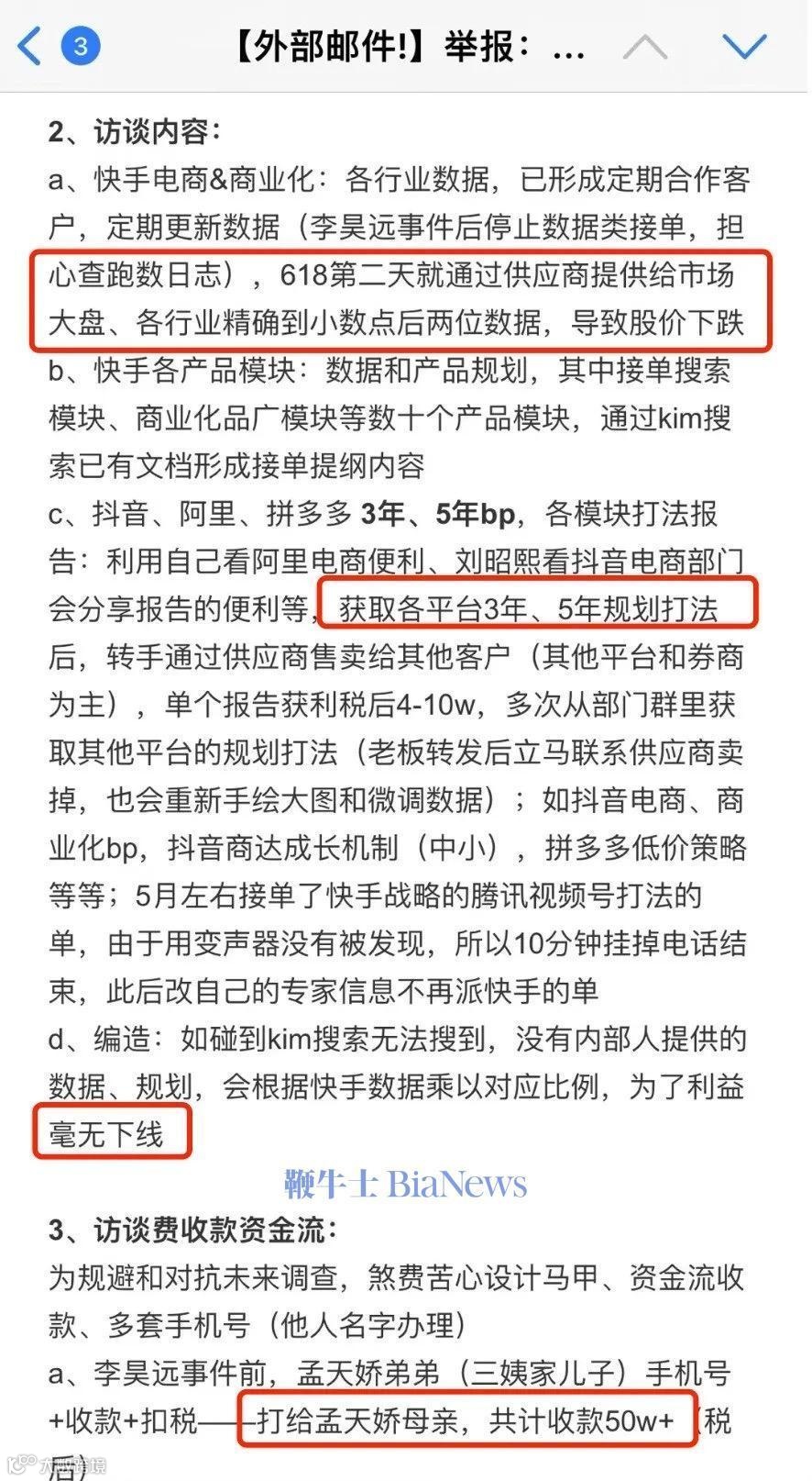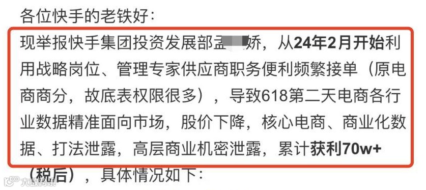 据举报信中的信息,泄密员工为孟女士,在快手集团投资发展部任职。自2024年2月起,她开始利用战略岗位、管理专家供应商职务便利频繁接单,导致618第二天电商各行业数据精准面向市场。