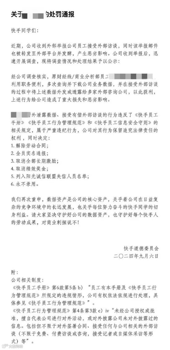 该员工对外泄露数据、接受有偿外部访谈的行为违反了快手相关规定,严重违纪,因此快手决定对其行为保留追究法律责任,同时决定: