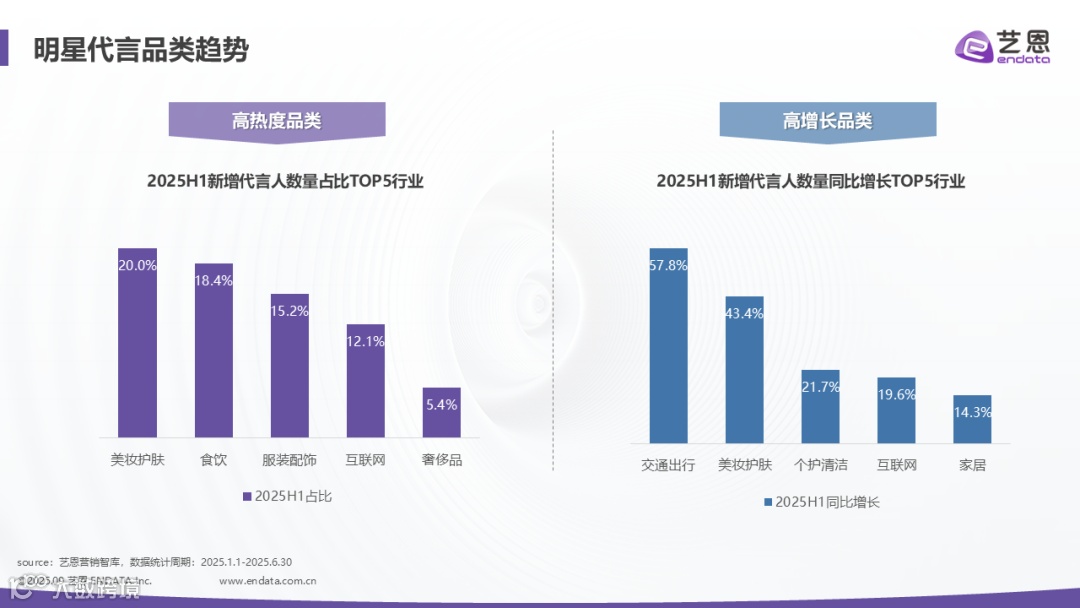 汽车行业成为2025上半年增长最快品类,新能源品牌如极氪、广汽传祺H1官宣次数分别达7次和6次。品牌更注重通过代言人塑造个性、讲述故事、建立情感连接。个护清洁与家居品类官宣增速进入TOP5,正从功能宣传转向生活方式营销。