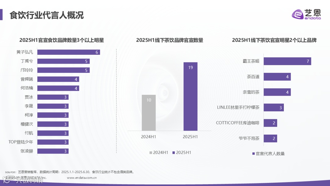 2025上半年,多位明星代言多个食饮品牌,黄子弘凡以6个代言居首。传统“竞品排他”协议出现新模式,允许明星代言不同细分品类或产品线。