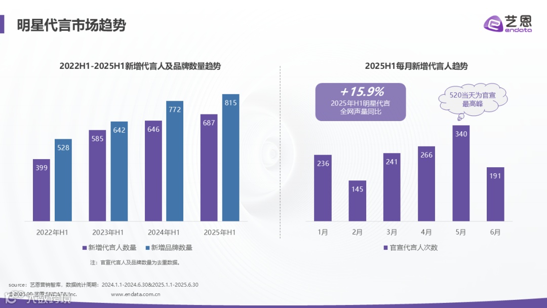2025年上半年,5-6月为代言高峰期,品牌普遍将官宣嵌入全年营销日历,借势618、双11、情人节等消费节点提升传播爆发力。据艺恩营销智库统计,上半年官宣最高峰出现在“520”当天。