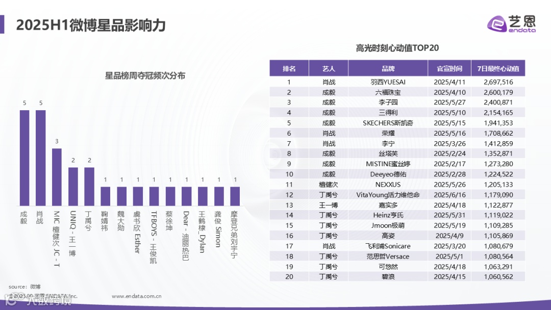 品牌数字资产沉淀方面,微博“星品榜”通过粉丝“送心”等互动行为,量化代言人商业价值。2025上半年数据显示,成毅与肖战均以5次周榜第一并列夺冠。心动值排行中,肖战(羽西)、成毅(六福珠宝、李子园)位列前三,前十均由两人包揽,体现其强大粉丝基础与消费转化潜力。