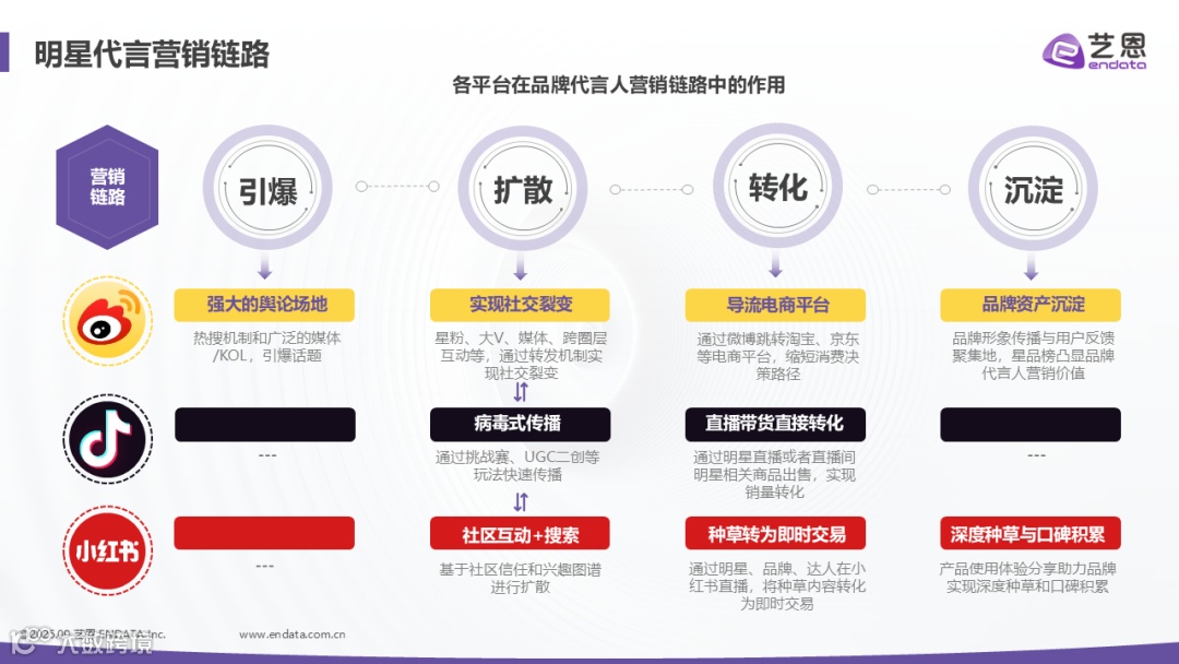 微博、抖音、小红书构成社交媒体时代代言人营销三大主战场:微博承担舆论引爆、用户互动与品牌资产沉淀;抖音依托算法推荐与直播电商实现高效转化;小红书通过种草内容积累口碑,完成心智渗透。三者协同形成“声量—销量—品牌量”闭环。