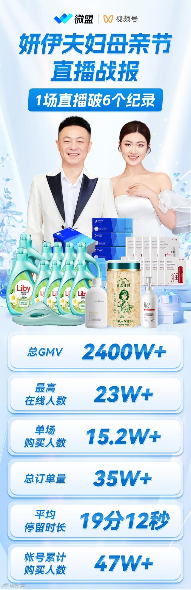 再往前一个月,视频号头部达人“妍伊夫妇”首战母亲节,直播仅1小时GMV超1000万,4小时GMV突破2000万,账号累计购买用户数 47W+,拿下视频号达人第一名。