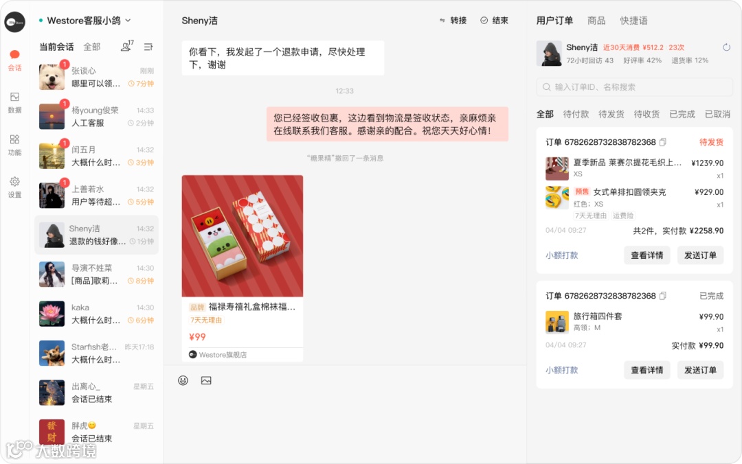 比如新客服系统实现了订单、售后等功能的整合,商家可以直接在客服系统中查看用户订单详情,解决了原来企微客服系统无法直接查看用户订单的痛点,极大提高了商家处理订单和售后问题的效率。