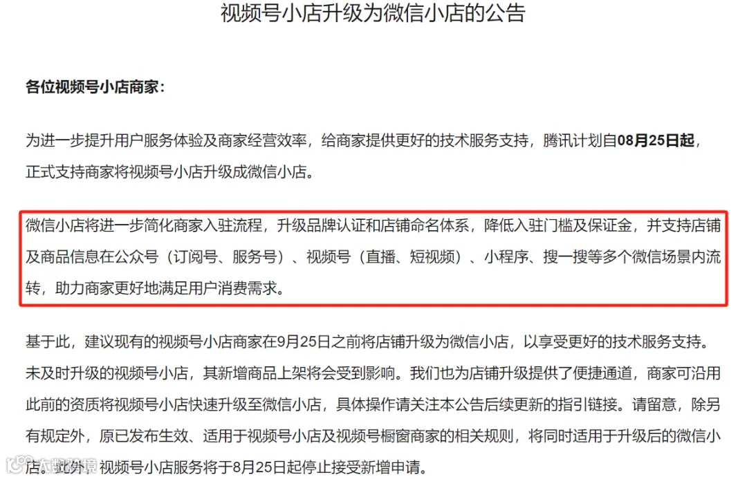 8月25日,视频号小店正式升级为微信小店,扩展了多渠道卖货、小程序跳转、搜索发现三个能力。
