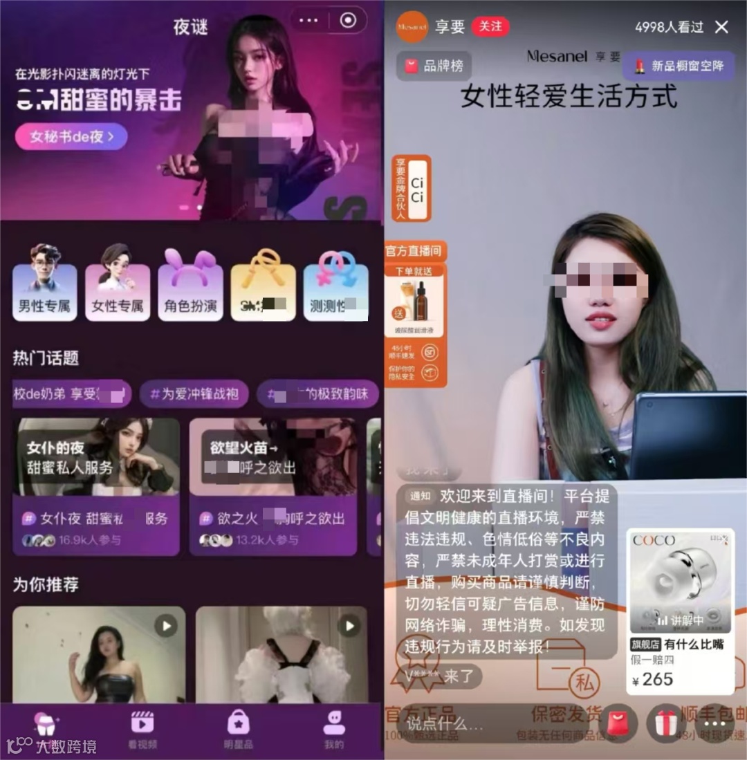 京东夜谜小程序和小红书情趣直播间截图对比