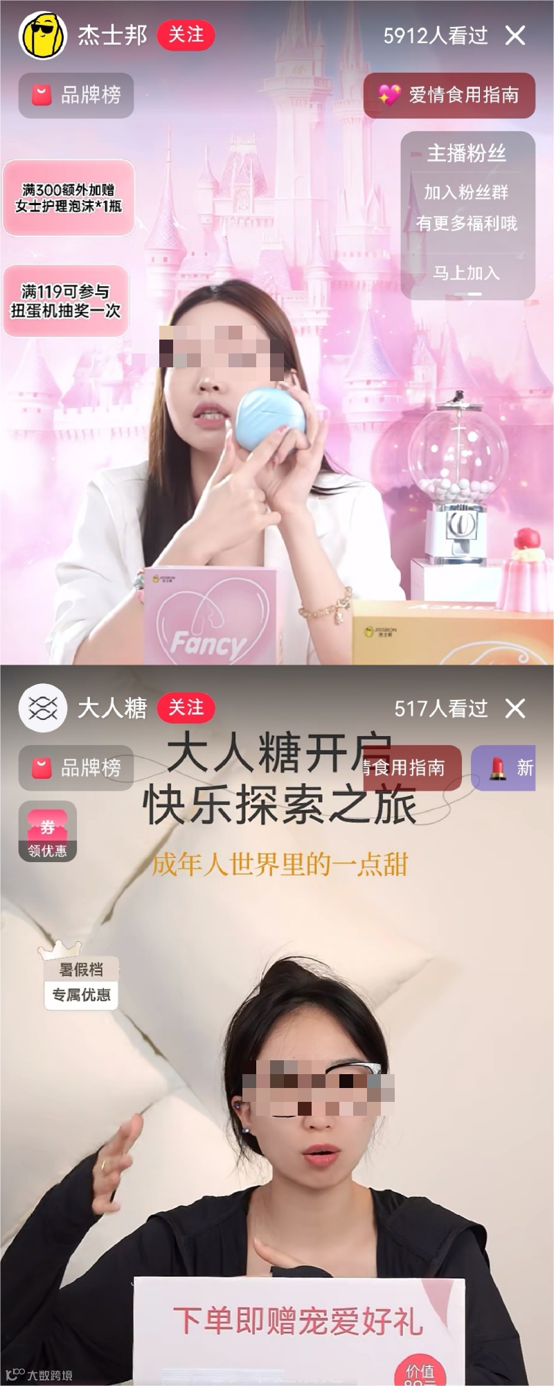 情趣品牌杰士邦、大人糖在小红书的直播间 上图:杰士邦 下图:大人糖