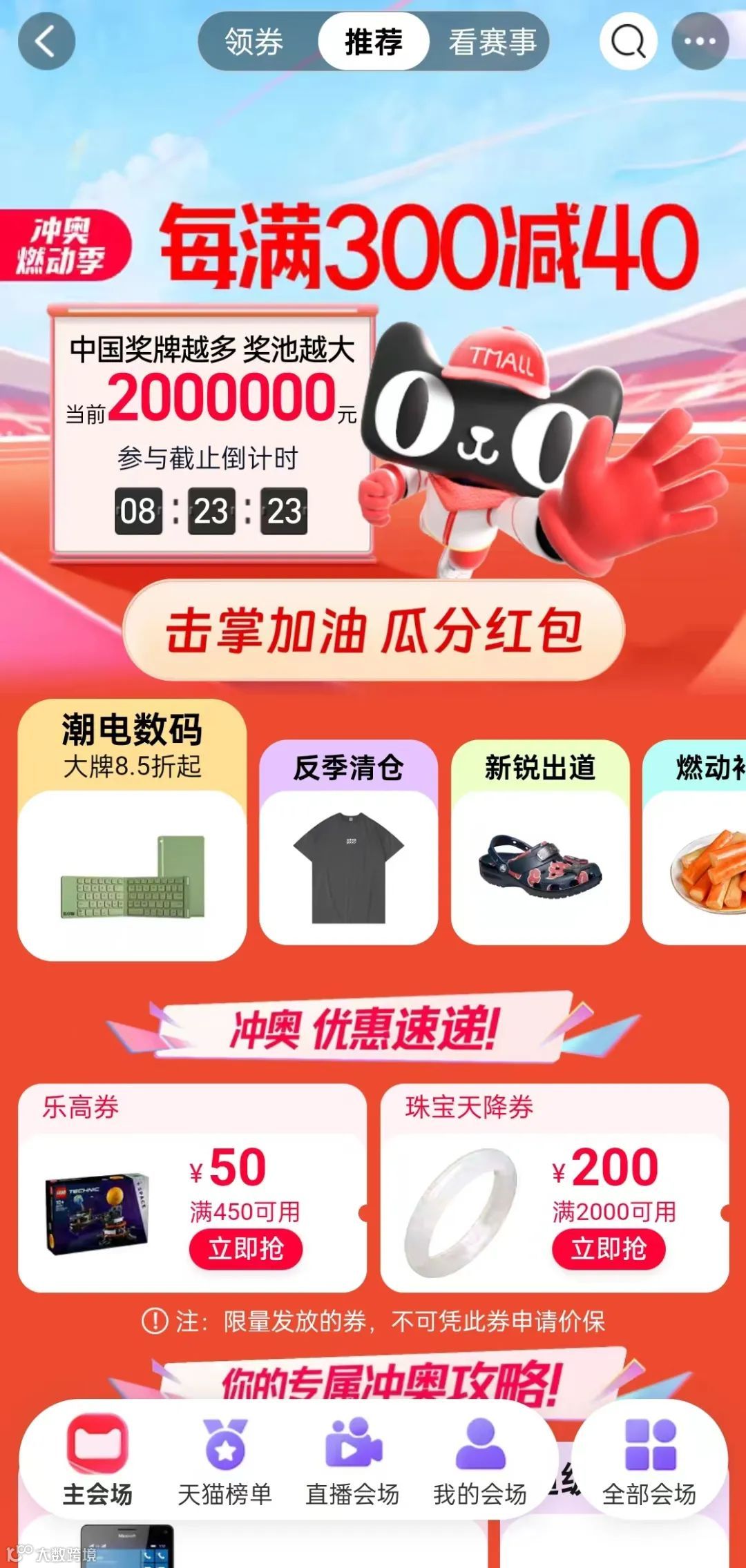 比如淘宝的“冲奥燃动季”,从7月27日奥运会开幕,一直持续到8月5日,主要的活动玩法还是跨店满减和官方立减。