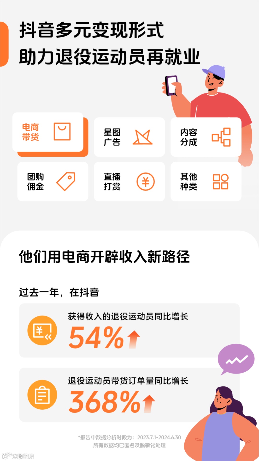 根据抖音最新公布的数据,过去一年,退役运动员在抖音发布的视频总分享量同比增长73%,总收藏量同比增长31%。其中,在抖音获得收入的退役运动员同比增长54%,带货订单量同比增长368%。