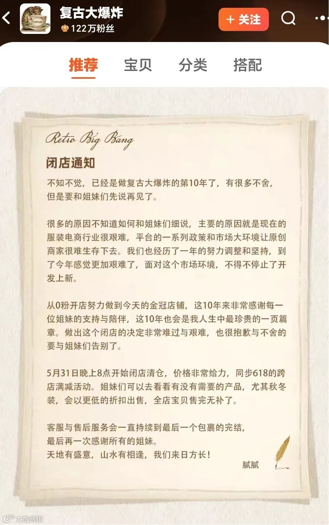 与之类似的是,不久前,一家在淘宝平台上拥有高达122万粉丝的金牌店铺——“复古大爆炸”,也不得不忍痛宣布了闭店的决定。